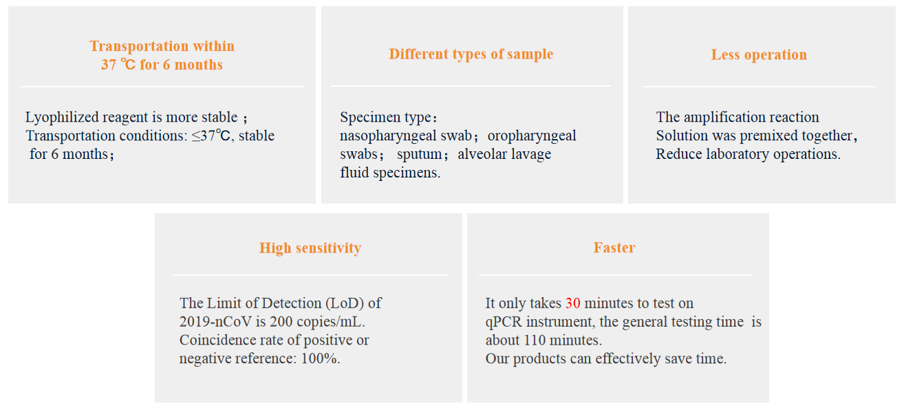 ? ORF1ab and N gene ? Simple operation process, no need long term staff training ? Direct sample types include: Nasal, Throat, and Nasopharyngeal swabs ? Enhance screening efficiency ? Internal control: human housekeeping gene RNase P