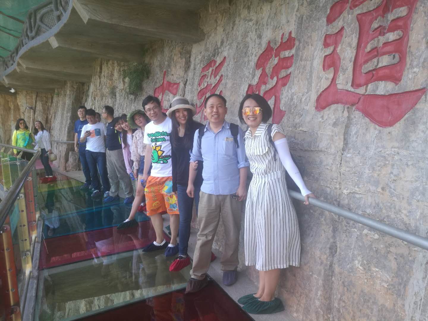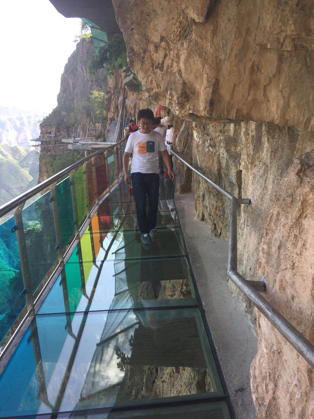 (豐盛的農(nóng)家菜) 團(tuán)建活動(dòng)part 2:挑戰(zhàn)七彩玻璃棧道 吃過(guò)午飯,一行人乘車(chē)去往東湖港。東湖港的玻璃棧道是七彩的,這是國(guó)內(nèi)首家“七彩玻璃棧道”,挑戰(zhàn)區(qū)全長(zhǎng)1200米,其中七彩玻璃128米,高差600余米。走在玻璃棧道上,猶如踩著一條長(zhǎng)長(zhǎng)的彩虹橋,驚險(xiǎn)刺激而又不失浪漫夢(mèng)幻!