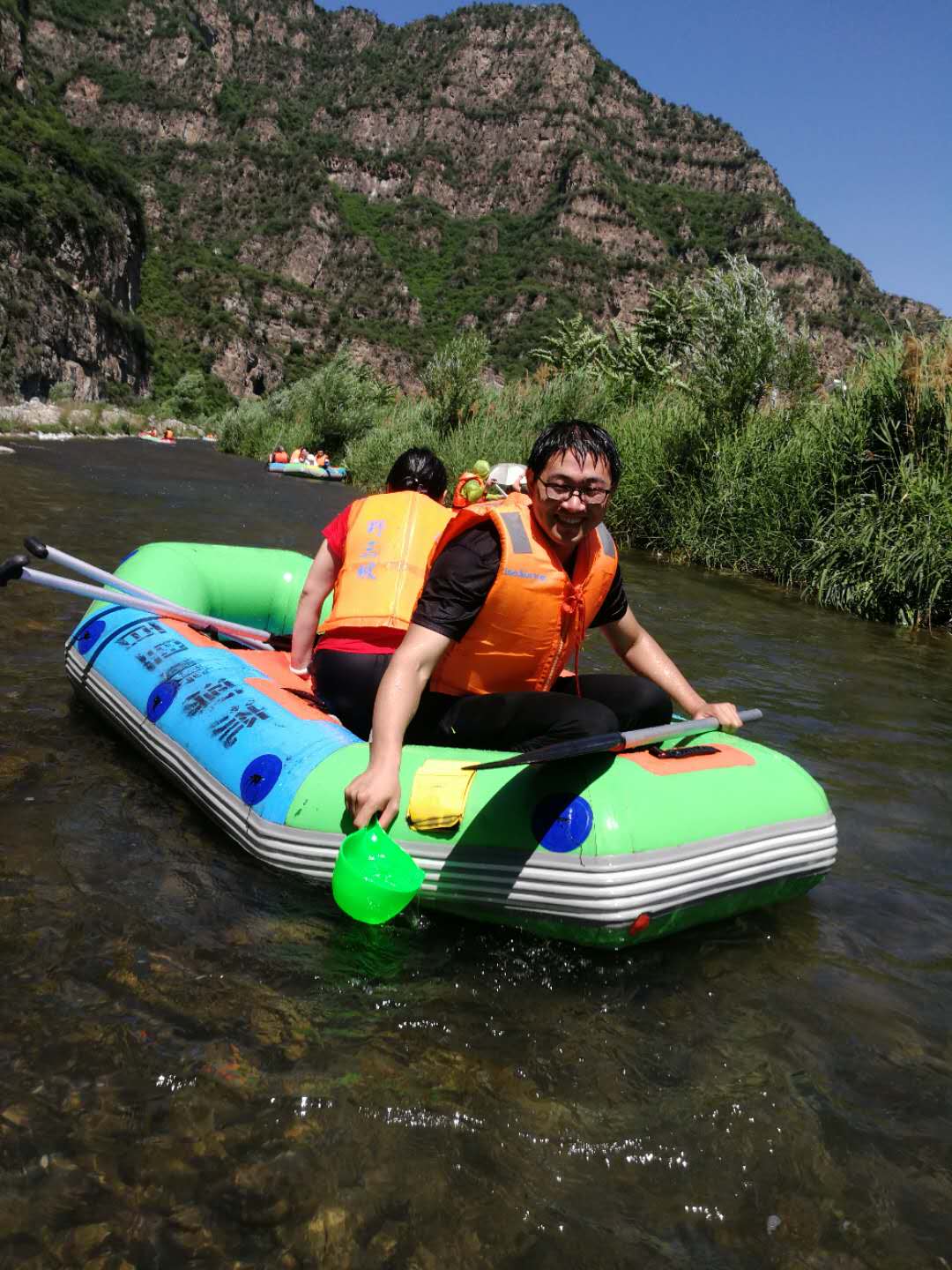 (漂流前合影) 集合完畢,大家紛紛領(lǐng)了裝備,穿上救生服,上了漂流船。 不得不說(shuō)這里的景色著實(shí)讓人流連忘返,在這里,我們可以領(lǐng)略險(xiǎn)峰絕壁,可見(jiàn)空中鸛鳥(niǎo)飛翔,河面鴛鴦戲水,水下魚(yú)蝦飛躍......嘩!不知何處的一瓢清泉澆滅了“小芯”的幻象,沒(méi)錯(cuò)這些都是想象,實(shí)際情況是潑!!水!!節(jié)!!話不多說(shuō),上圖: